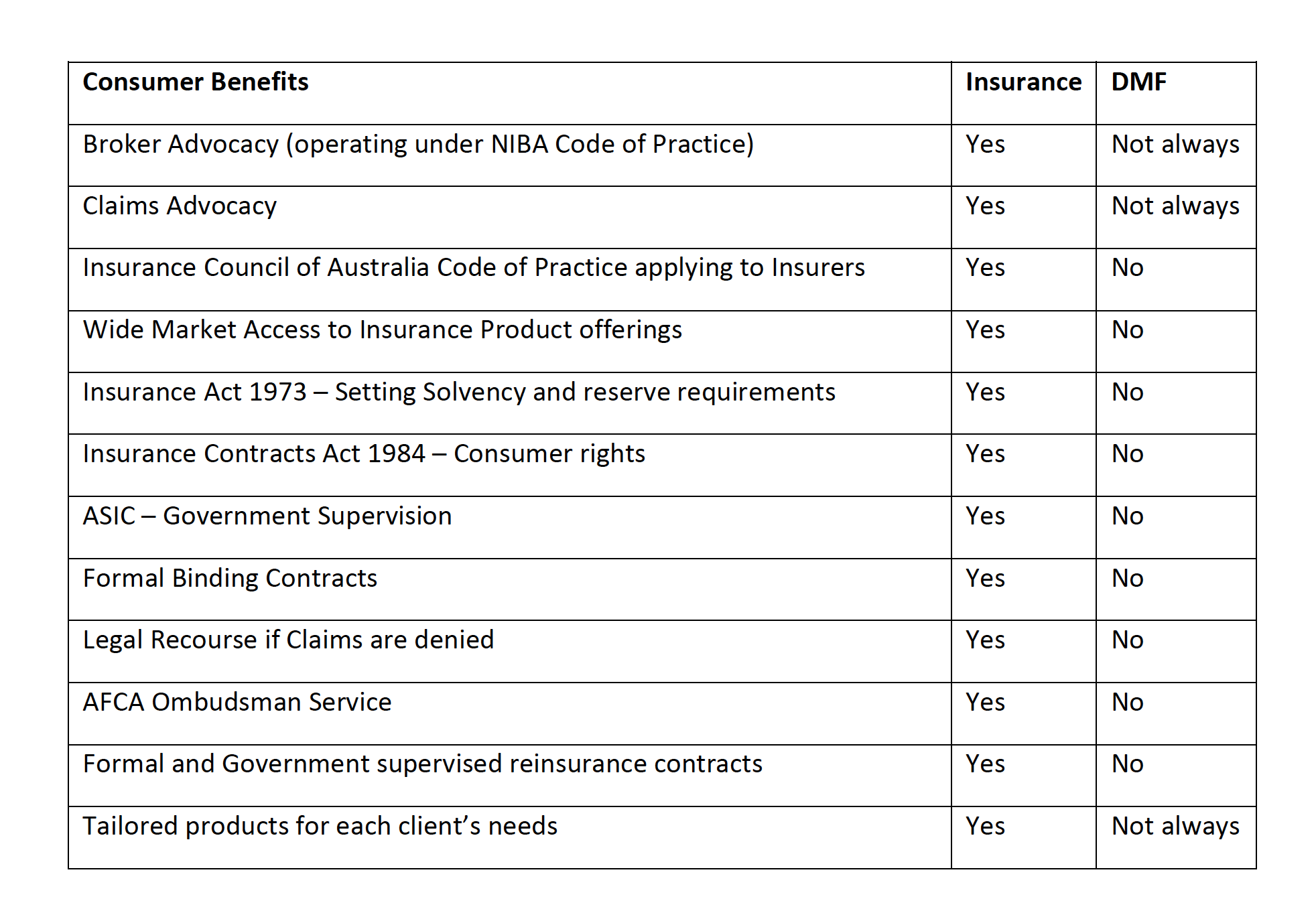 A Discretionary Mutual Fund (DMF) is not legally a contract of insurance; therefore, it avoids major insurance laws (Insurance Act 1973 and Insurance Contracts Act 1984), both of which provide key protection for consumers, including solvency and reinsurance requirements.
